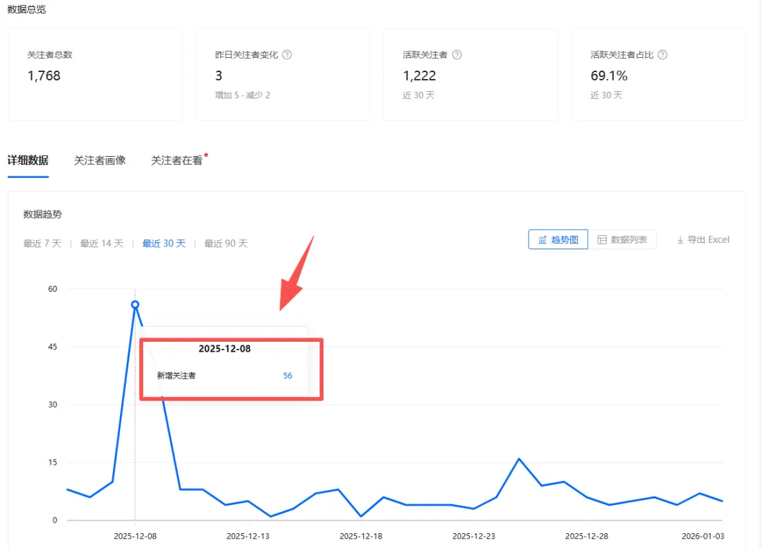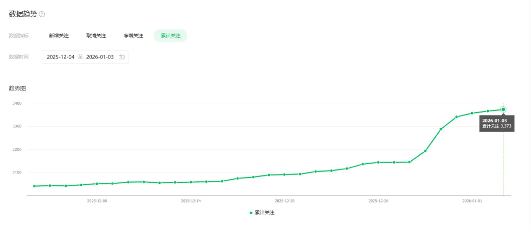 用户增长方面从12月5号到1月3号新增关注222人,目前累计关注1768人。