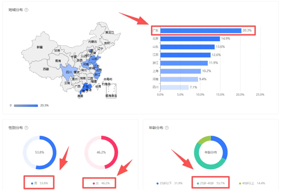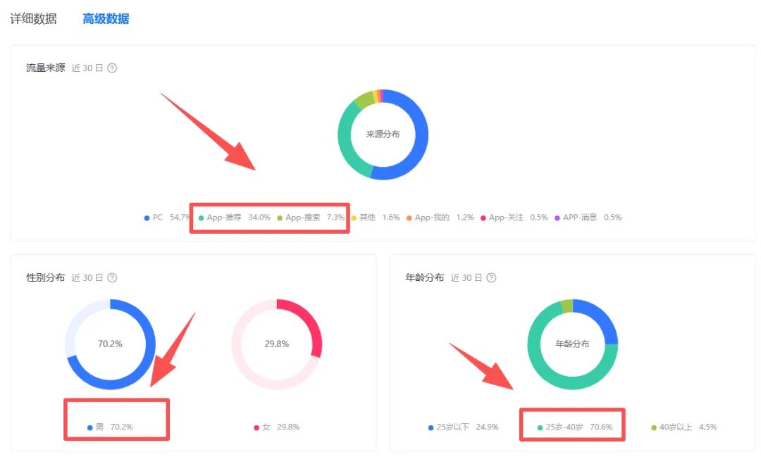 App-推荐流量占比34%,App-搜索流量占比7%。男性占比7成,女性占比3成。25岁~40岁用户占比70%。用户属性方面男性用户占比53%,女性用户占比46%,女性用户占比比公众号和小红书略高。年龄集中在25岁~40岁,占比53%。