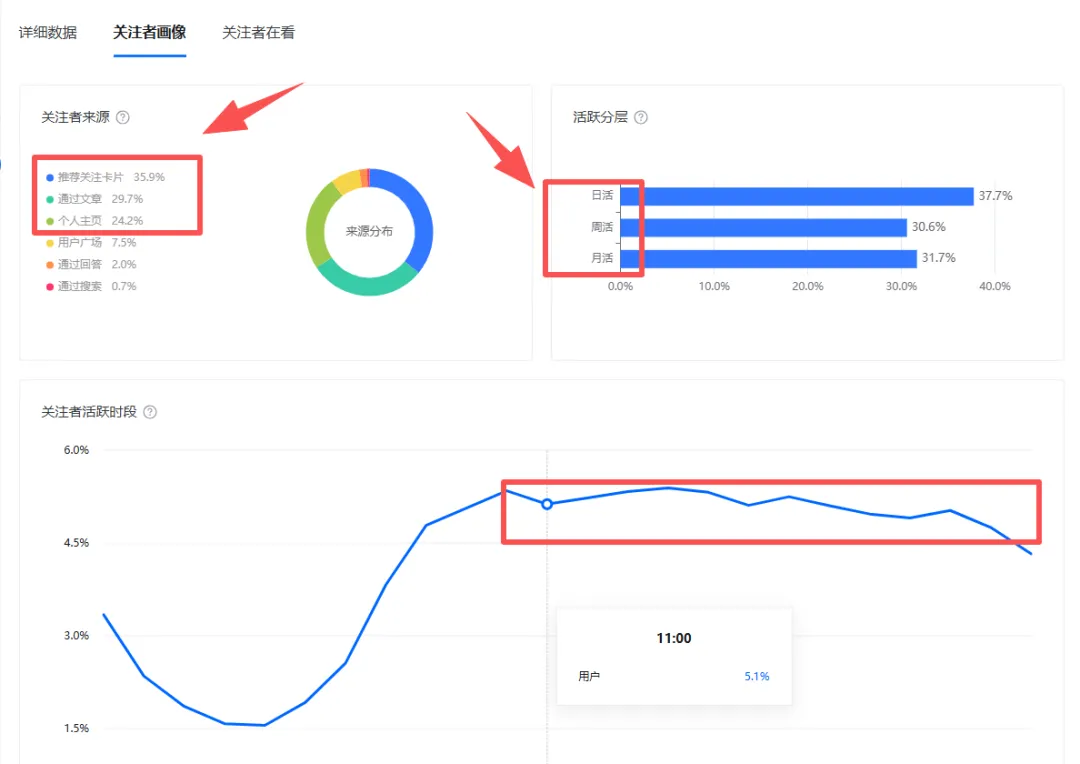 兴趣分布版块这个看不太明白,看起来挺均衡的样子。通过文章关注的占比只有3成,个人主页关注的占比24%,排名第一的是推荐关注卡片占比35%,这个应该是官方流量扶持来的吧。