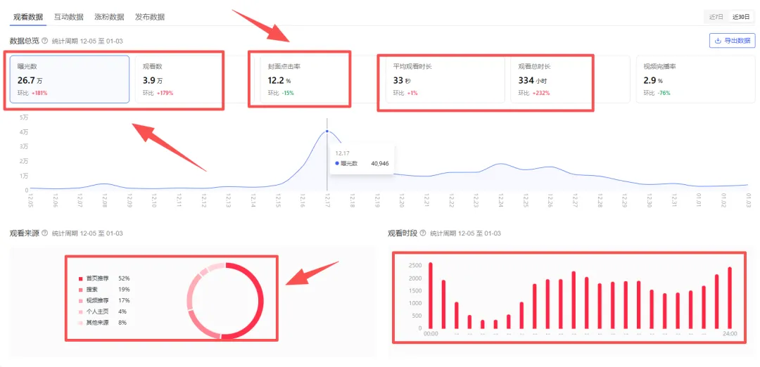 内容干不干的另说,这个雷达图还是挺酷的,至少保持日更,足够勤奋。流量占比方面最近一个月(12-05~01-03)的累计曝光数26.7w,点击率12.2%,观看数3.9w。平均观看时长33秒,观看总时长334小时,视频完播率太低只有2.9%。