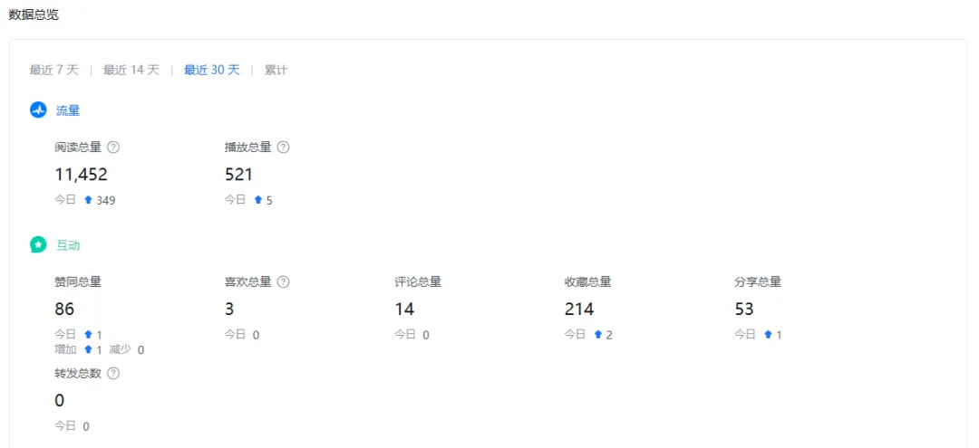 知乎的数据一直很迷,我也看不太懂,像单日新增50多关注,我都不知道是什么原因。之前还专门咨询了官方的小姐姐,感觉还是弄不太明白。流量占比方面最近一个月总的阅读量是11000+,视频播放量500+。