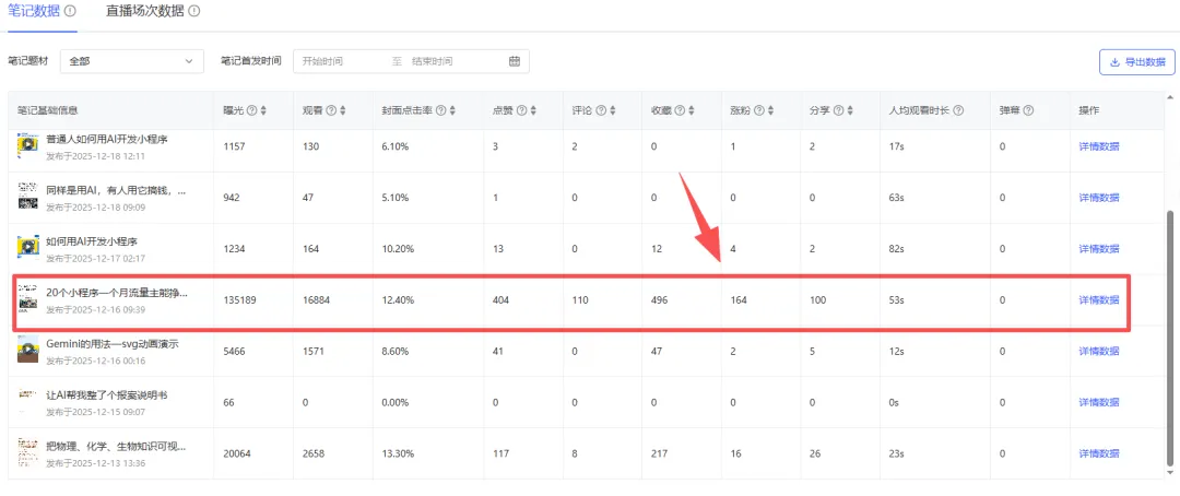 看来大家还是喜欢真实的数据,喜欢搞钱。小红书的算法也比较给力,16000+的浏览量估计10000个是同行(狗头.jpg)。账号大盘数据最近一周(12-28~01-03)账号大盘数据,看起来还挺全面的,五边形战士,观看、互动、涨粉、主页访客、发布数遥遥领先同类创作者。