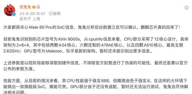 此外,大家比较关心的处理器方面,虽然华为官方没有对此公布,但是相关的评测机构已经对Mate60Pro进行了识别,并判断其搭载的处理器型号为麒麟9000S(Kirin9000s),并且这款芯片拥有优秀的综合性能。
