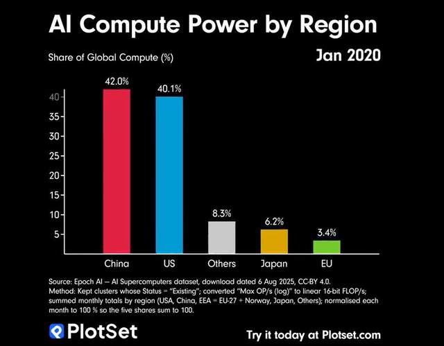 知名机构Plotset最新数据显示,截至2025年8月,美国AI算力占全球68.9%,稳坐头把交椅;中国以14.5%排第二,欧洲6.1%,日本仅1.2%。这组数字背后,藏着中美AI算力格局的剧烈变化。