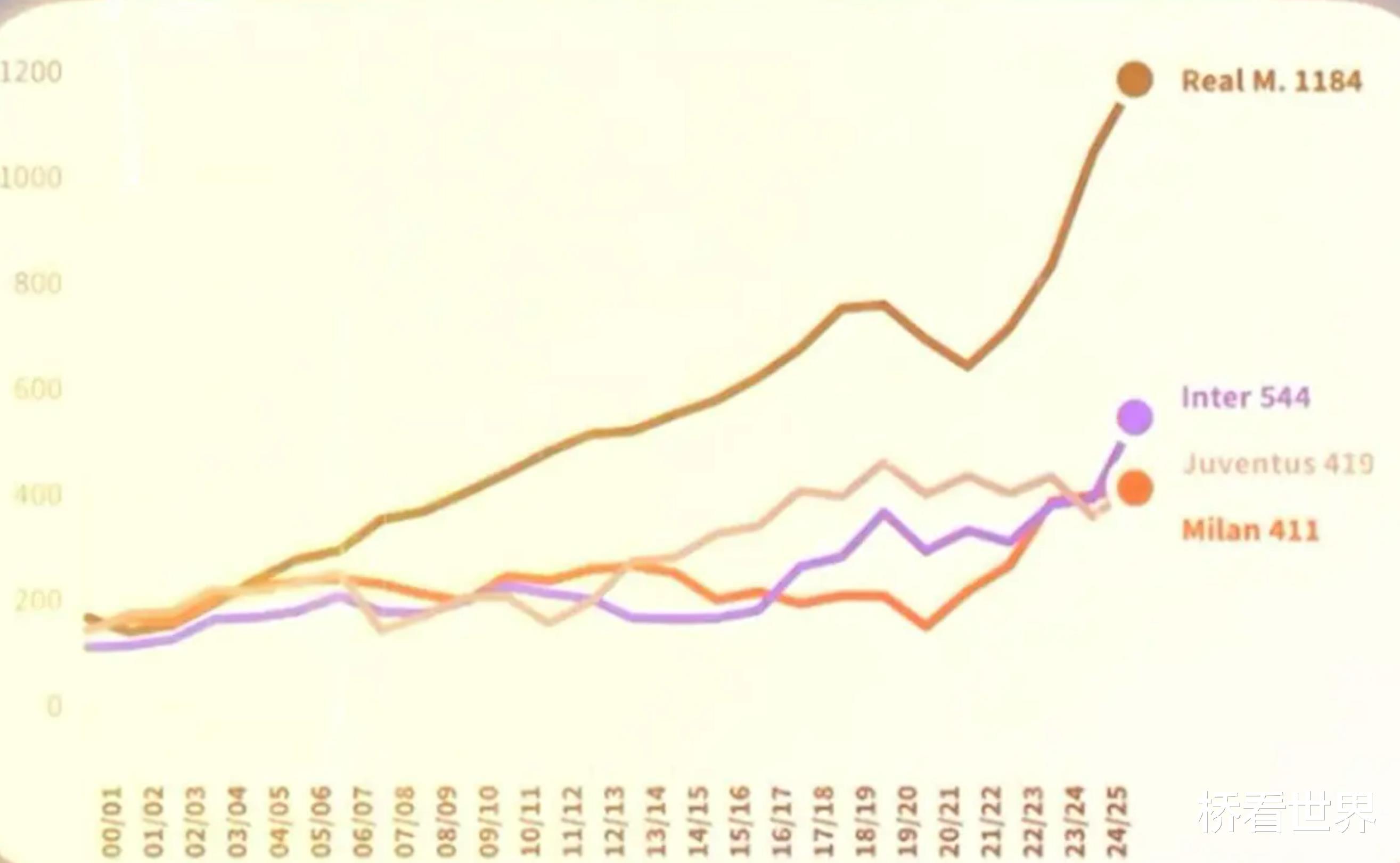 然而,七年之后,即便国际米兰创下三冠王的辉煌战绩,其营收规模也仅为皇马的一半 —— 当时皇马的营收已逼近 10 亿欧元大关。