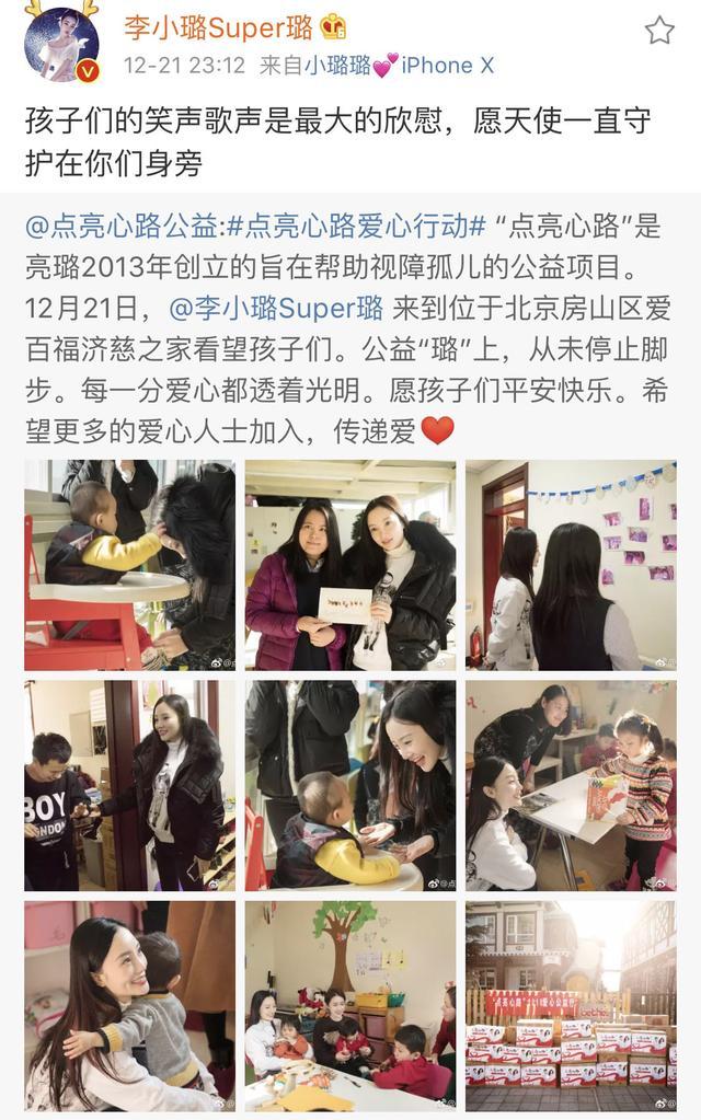 李小璐只要闲下来就会来探望孩子们,今年也不例外,刚进到学校,就收到了孩子们为小璐姐姐做的圣诞贺卡,陪孩子唱歌,讲故事,爱百福官微说到这样一个细节,“小璐姐姐”抱着我们最小的宝宝‘那个萌’,宝贝依偎在小璐姐姐怀里,这时,小璐姐姐说,我要把外套脱掉,上面的毛领怕扎到孩子眼睛。”陪伴是长情,大爱甚是美好。