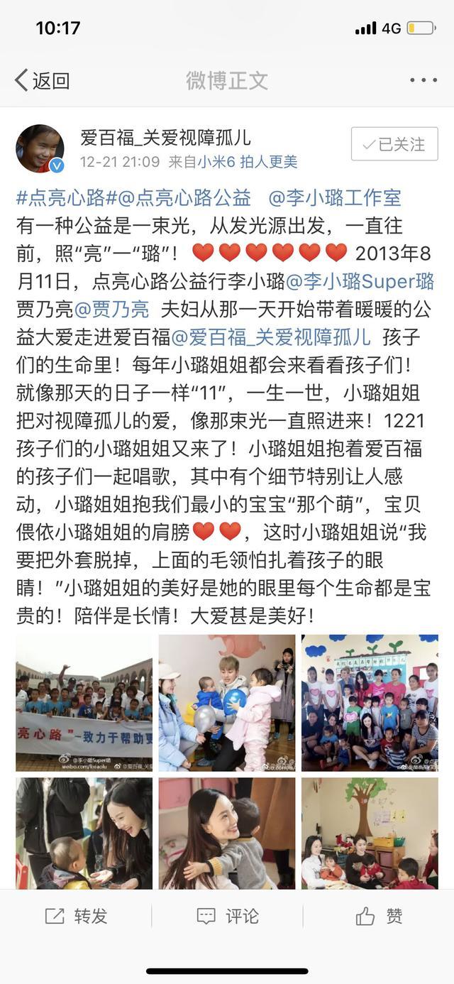 李小璐带着爱心物品驱车2个小时来到位于北京房山区爱百福济慈之家盲童学校看望孩子们,为这群特殊的天使送去真诚的关怀。“点亮心路”是亮璐于2013年6月创立的帮助视障孤儿的公益项目,4年来,公益“璐”上,从未停止脚步。每一分爱心都透着光明。愿孩子们平安快乐。希望更多的爱心人士加入,传递爱