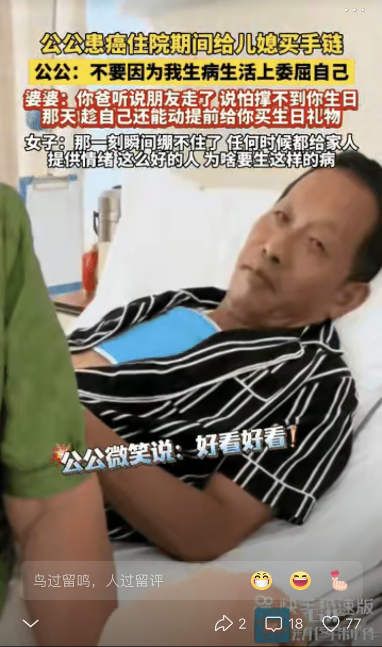 病房里的消毒水味浓得化不开,癌症正一点点吞噬着老人的气力,可郑州这位公公的心里,始终揣着一件事——儿媳妇的生日就快到了。