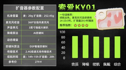 好牧人无线领夹式扩音器功能全面,360°全指向麦克风全方位收音,3英寸内磁大喇叭扩音声纯净无干扰;车规级DSP防啸叫芯片保障无啸叫,2.4G无线+有线双模式,30米无线传输稳定,Type-C充电便捷,还支持录音、蓝牙、TF卡。遗憾的是扩音器256g偏重,携带有负担,麦克风14.5g佩戴轻盈。续航表现出色,扩音器30h续航,麦克风4-6h,适合需要长时间使用,且能接受一定携带重量的场景,如教学、户外讲解等。品牌三:索爱产品型号:索 爱KY01无线领夹式扩音器推荐指数:★★★★推荐语:3英寸强磁大喇叭让扩音声音更饱满,2.4G无线+蓝牙5.4双传输