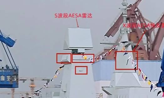 054B护卫舰最大的升级则集中在航电系统。主桅顶部安装有S波段的旋转双面阵AESA雷达,尺寸非常巨大(接近3.5米),而且据称采用的最先进的氮化镓材质,单个DAM模块平均输出功率更是高达40瓦。据称其综合性能超过了美国伯克2A型驱逐舰使用的SPY-1D(V) 无源相控阵雷达,并不弱于美国星座级护卫舰上使用的SPY-6(v3)型AESA雷达。