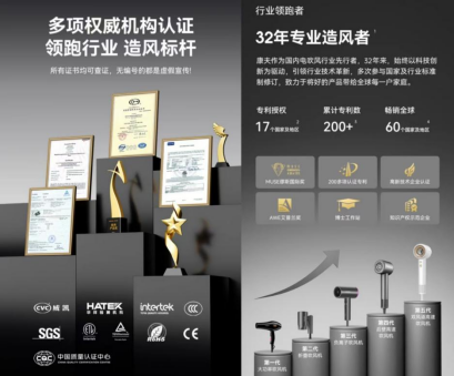 我在购买日常用品时往往会选择比较知名的品牌,因为这些品牌旗下产品虽然看起来要比小品牌同类产品贵一些,但质量无疑更有保障。对比了很多吹风机品牌,最后选择了康夫。康夫算是中国中国吹风机行业极具代表性的国民品牌,已经有31年的品牌历史在行业内拥有着极高的声誉和影响力。还是国家家用电器标准委员会成员及中国家用电器协会吹风机团体标准起草单位,多次参与行业标准的制定与修改,这不仅体现了康夫在行业内的重要地位,也说明了康夫的产品质量和技术水平得到了行业的认可。而我这次选择的康夫S9也在天猫新品榜内,这些都充分证明了康夫品牌的实力和产品的质量可靠性。