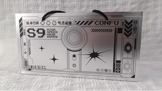 康夫S9高速吹风机外包装采用的是Y2K复古科技风格的限定礼盒包,买来送人时提着的确更加方便。外包装图案设计在呈现出吹风机的型号和卖点的同时还融入了未来感元素,像赛博朋克线条和像素风图案等,可以很好的凸显科技氛围。整体包装既唤起人们对过去复古风格的回忆,又展现出对未来科技的畅想,能快速人们的目光,传递出产品的个性与时尚感。
