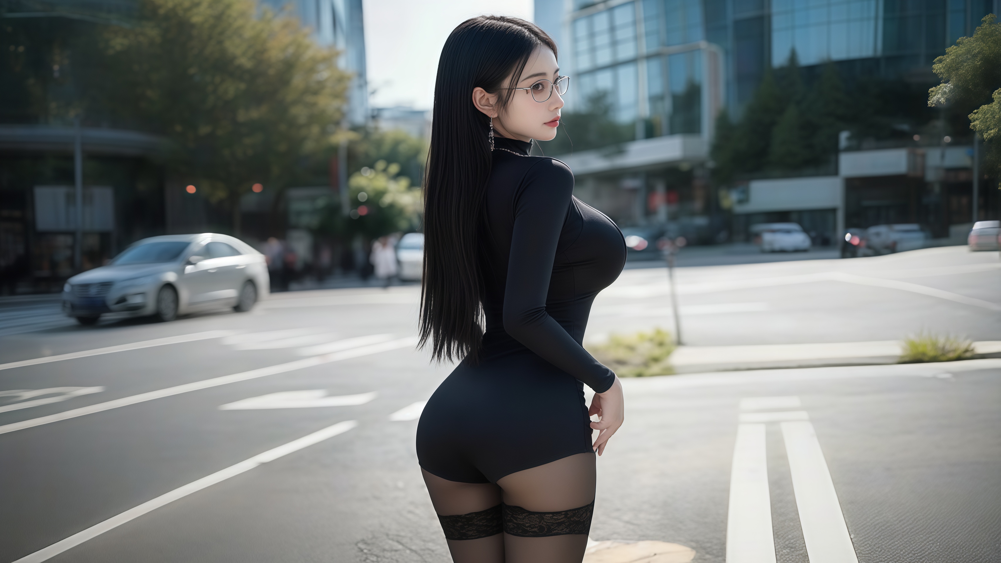 在初冬的午后,阳光透过高楼之间的缝隙,洒落在城市街口。她站在斑马线旁,黑色紧身连衣短裙勾勒出利落的线条,蕾丝长筒袜在光线下泛着细腻的纹理。手中那台黑色相机,仿佛是她的另一双眼睛,随时准备捕捉街头的瞬间。镜片后的目光沉静而专注,像是在审视世界,也像是在等待一次恰到好处的快门声。