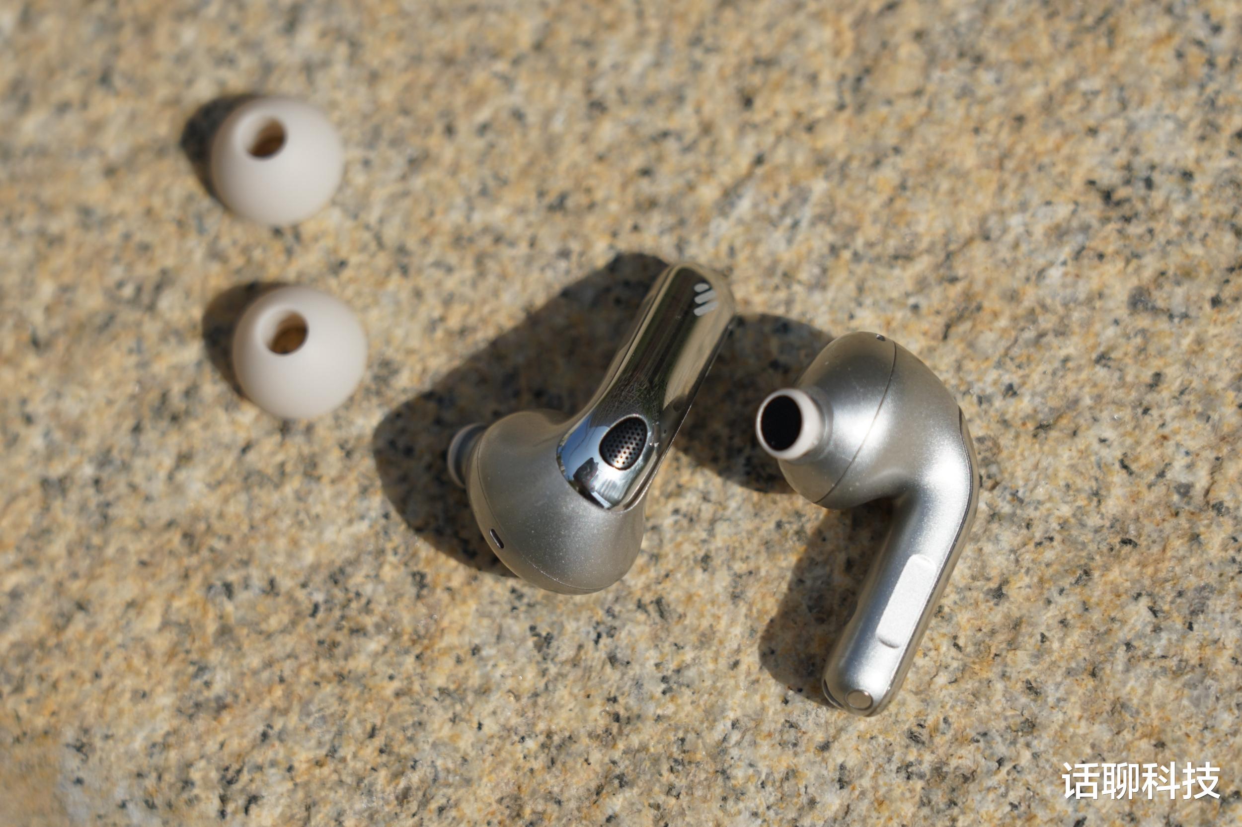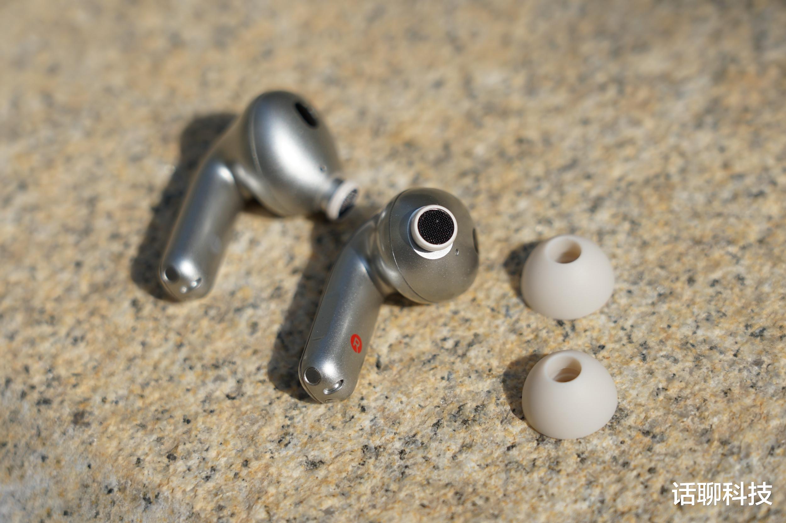 作为降噪耳机其采用三麦克风拾音设计,分别在单元顶部、单元背部以及耳机短柄底部,多方向分布,检测环境音也更灵敏。并且在耳机短柄触摸操控区域还做了一个手指能感知的平面切割设计,更方便盲操作。