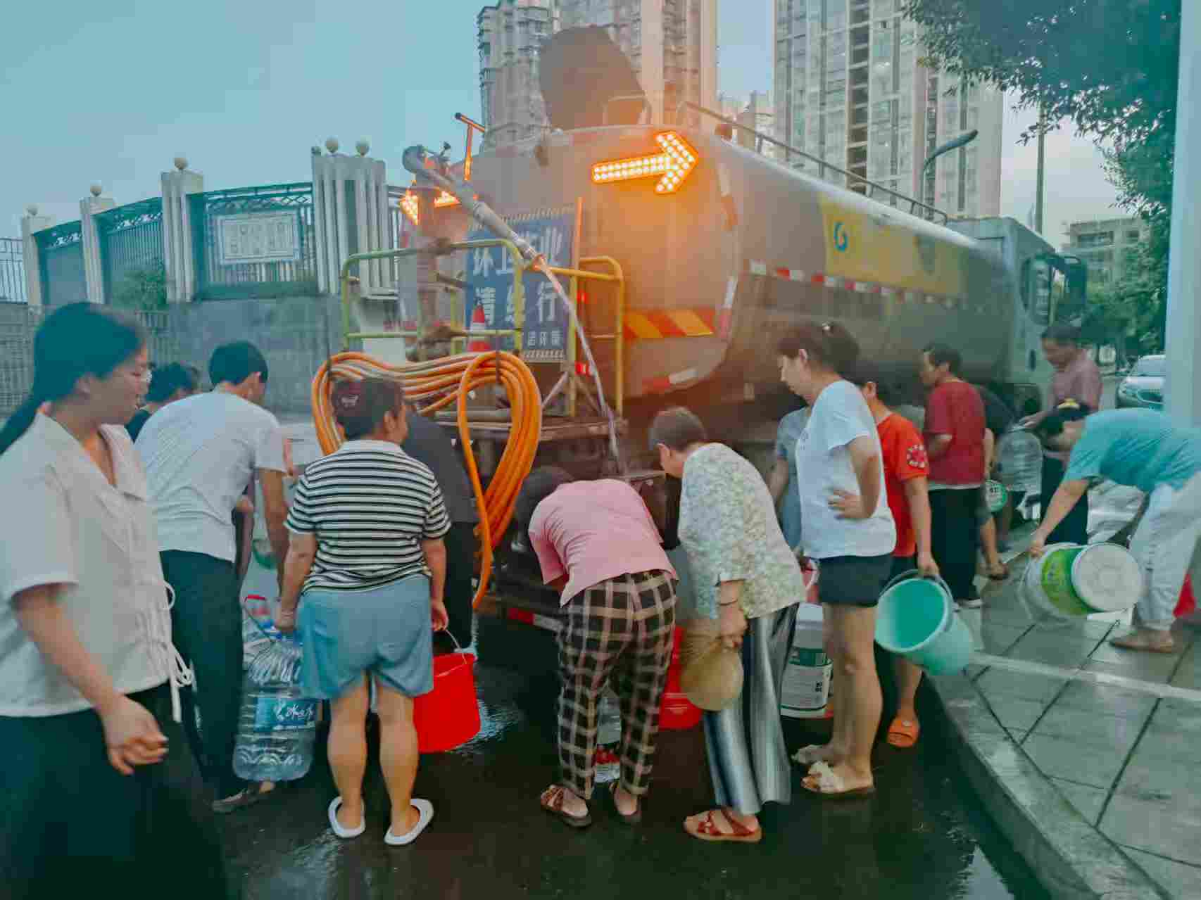 在取水点位,环卫工人熟练操作设备供水,维护现场秩序,指导居民安全接水。
