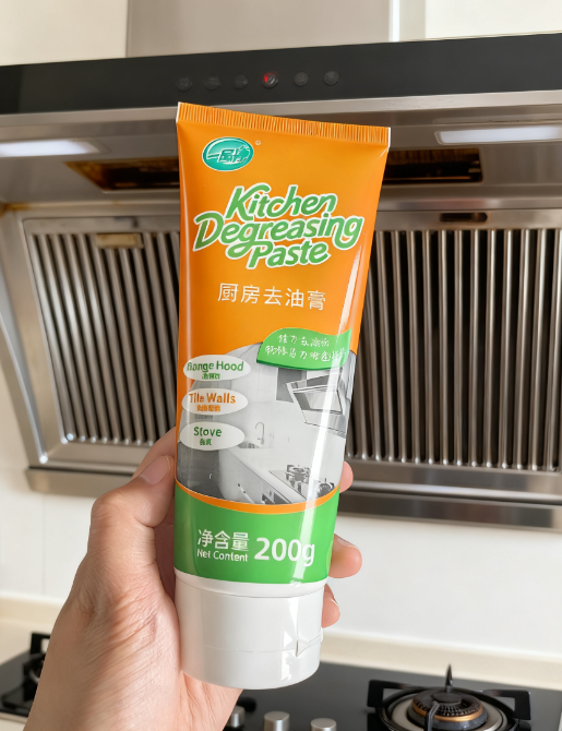 以前我都是拿钢丝球拼命刷,刷完手疼还没干净。 现在直接挤点膏体在油污上,等几分钟,用湿布一擦,油渍就像被“溶化”了一样,轻松搞定。
