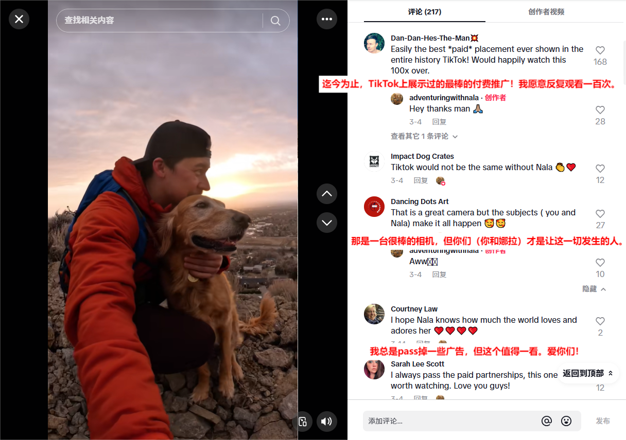 运动相机GoPro也一样,他们找了一位宠物博主拍她和狗狗在雪地里奔跑的视频,全程用GoPro拍摄,画面稳又清晰。用户留言说:“这相机好棒,狗狗也好可爱!”——产品就这样悄悄被记住了