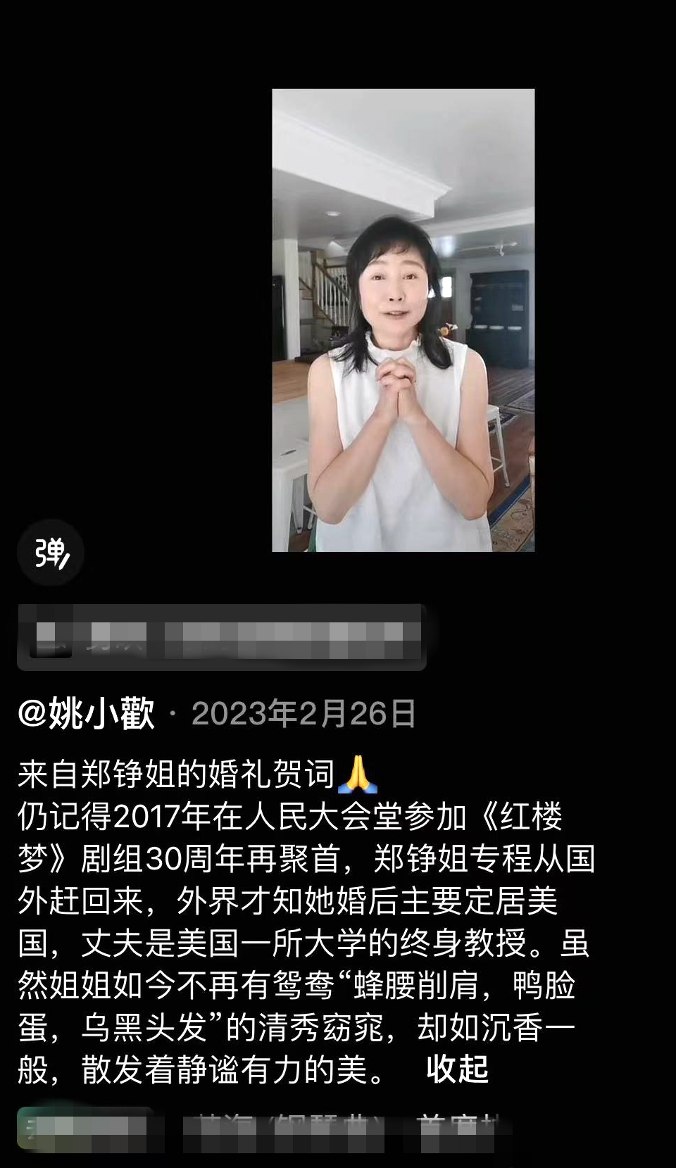 2023年2月,郑铮给好友姚欢录制了祝贺新婚的视频,当时她状态不错,从背景看,应该是身处美国的家。