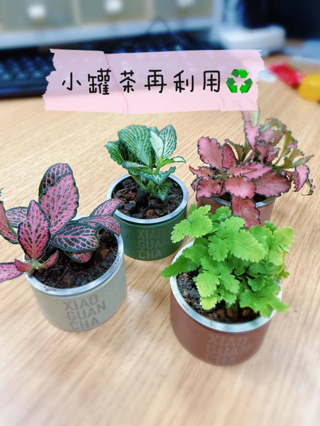 一定要记得在废旧茶叶盒的底部多扎几个小眼,方便日常浇水时沥水,不然水积在废旧茶叶盒的底部,容易导致花草烂根。
