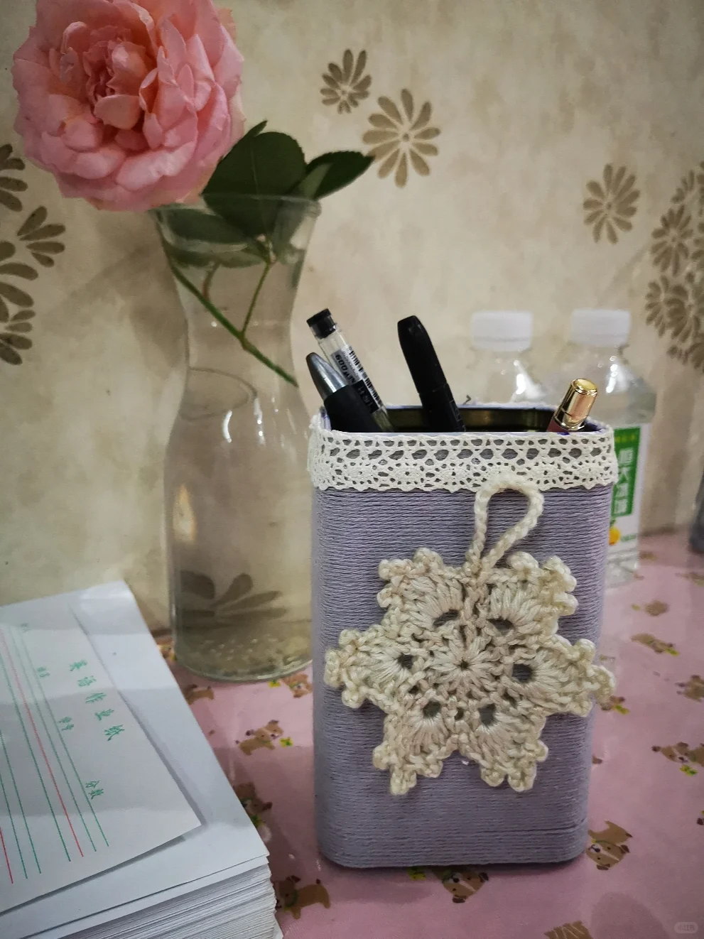 改造的方法非常的简单,只需要用棉线一圈圈的缠绕即可,简简单单的改造即可让你家中的废旧茶叶瓶变成花瓶,是不是超级的简单和方便呢?