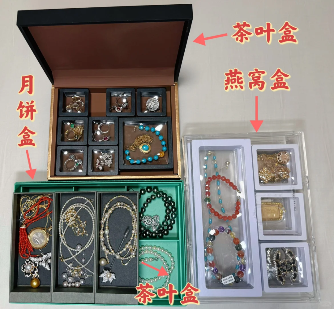 如果茶叶盒比较大的话,个人建议可以用木板来做多层的分隔板,这样分类收纳还不用担心首饰会缠绕在一起,不方便拿取。