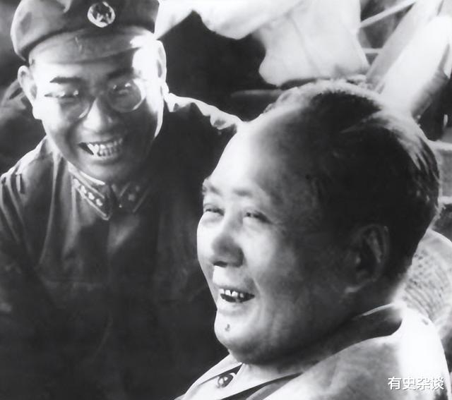 陈赓无法忍受,遂含笑躲至毛主席与朱老总身前。