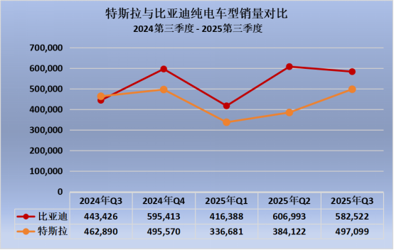 2025年第三季度,比亚迪再度在全球纯电汽车市场上领先特斯拉。根据官方产销快报和特斯拉第三季度季报,比亚迪第三季度纯电车型销量达582522辆,而特斯拉交付量为497099辆,比亚迪单季度领先85423辆。