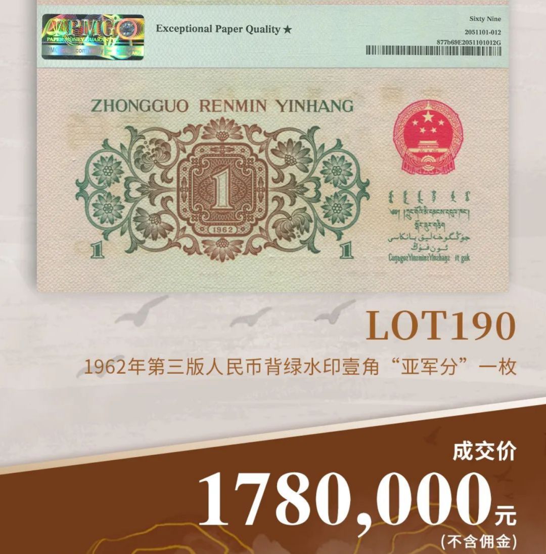 就是这样的1角纸币,在拍卖会上屡屡有亮眼的表现,有一张带水印的,甚至拍出过178万。