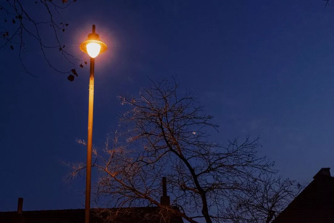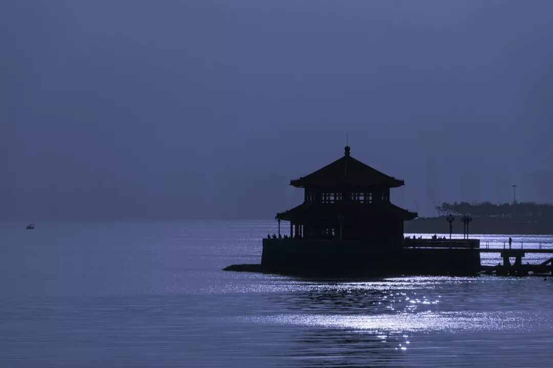 深蓝色天空与暖色灯光形成舒适的色彩对比。▼