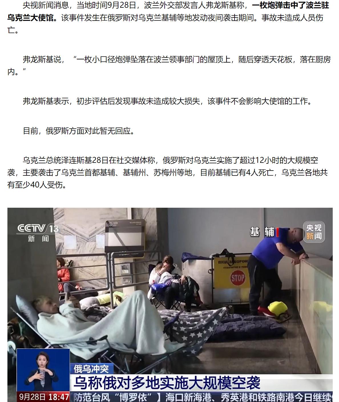 9月28日晚,也就是林佳龙访波的第二天,波兰驻乌克兰基辅大使馆在一场俄军的导弹袭击中被碎片击中。虽然不算直接命中,但导弹碎片穿透屋顶,落入大使馆厨房,造成建筑部分损伤。