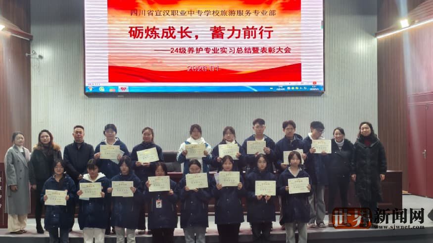 中梭通在线四川讯(罗敏 严雪)2026年1月7日上午,宣汉职专旅游服务专业部在校学术报告厅举行“砺炼成长,蓄力前行——24级养护专业实习总结暨表彰大会”。学校党委委员、纪委书记李建军,专业部管理团队,该专业全体班主任、任课教师及学生参会。会议由旅游服务党支部书记秦灵祝主持。