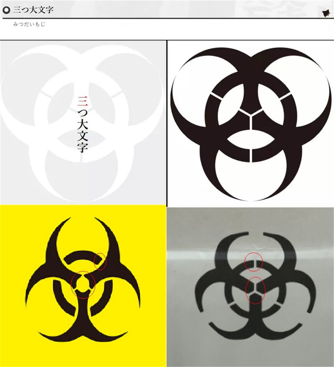不过,如果你像博士一样仔细的话,还是能看出两个标识只是类似,并不完全一样。两者有多处细节差异,放在一起对比很容易就看出来。生物危险标识上面已经介绍过了,至于大阪屋的标识当然和生物危害没有任何关系,而是一种称为“三つ大文字”的日本传统家纹。顾名思义,这个家纹是由三个“大”字所组成,其实,日本很多“大”开头的家族或店家都会使用这种设计的家纹。
