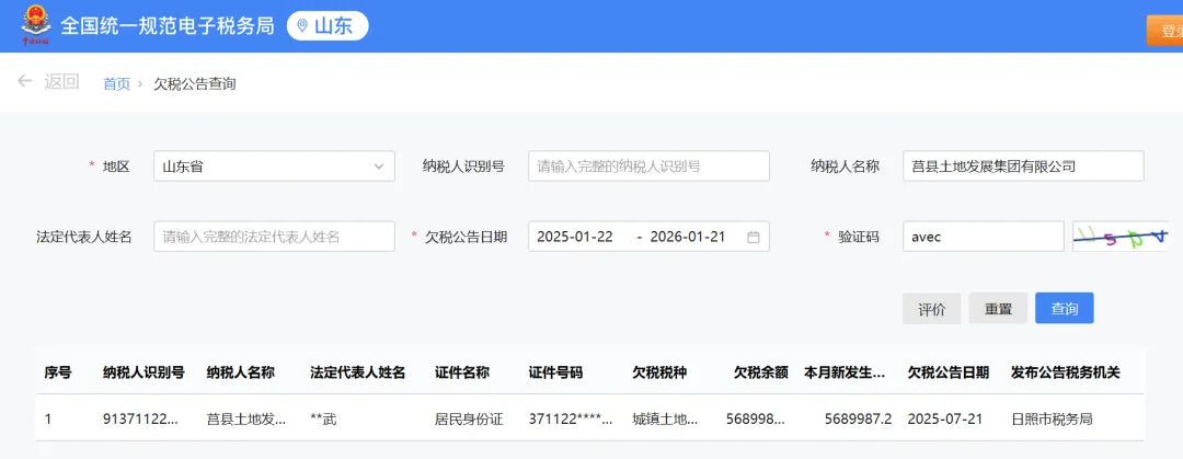 经全国统一规范电子税务局查询显示,截至2025年7月21日 ,莒县土发欠税余额约569万元,均为当月新发生欠税金额,欠税税种为城镇土地使用税。