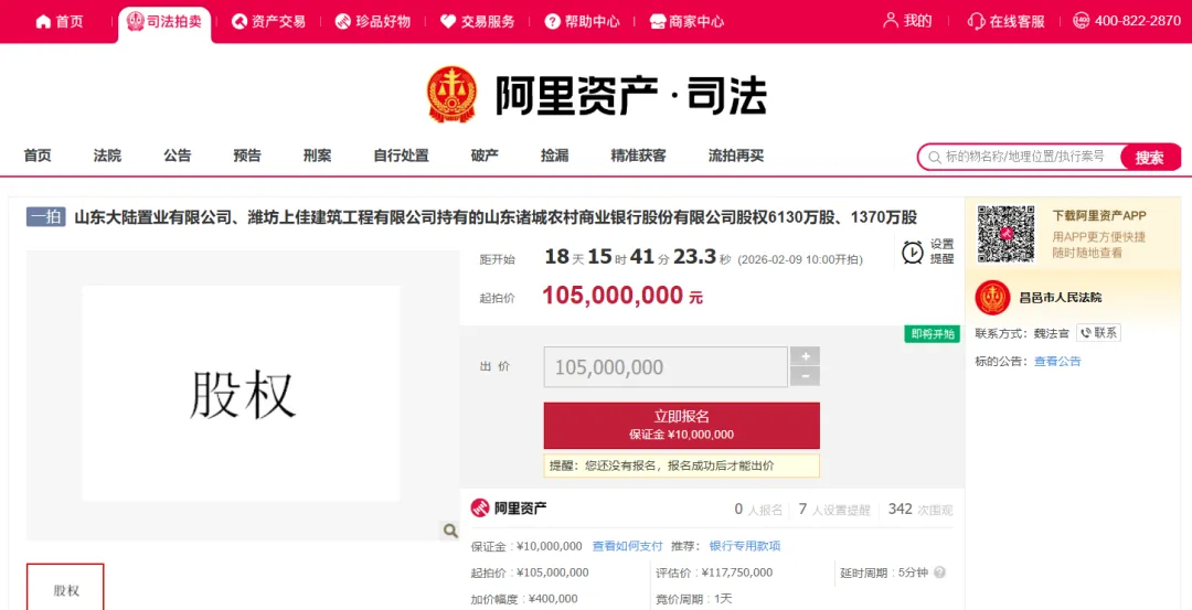 据阿里资产司法拍卖平台提供的信息显示,诸城农商银行7500万股股权将于2026年2月9日公开拍卖,起拍价为1.05亿元,每股均价1.4元。