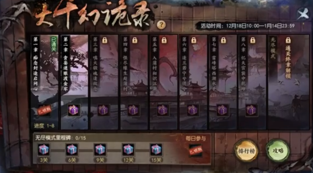 除此之外,最近开启的玩法【大千幻诡录】也相当有趣,技能自动施放,只需走位躲避攻击即可。你可以升级强化技能来获得更强的战力,通过八章关卡后即可开启无尽模式。在无尽模式中你需要尽可能存活更多的关卡,存活越久就越有可能登上排行榜,各位不妨来试试看,说不定你也能成为万众瞩目的存在哦!