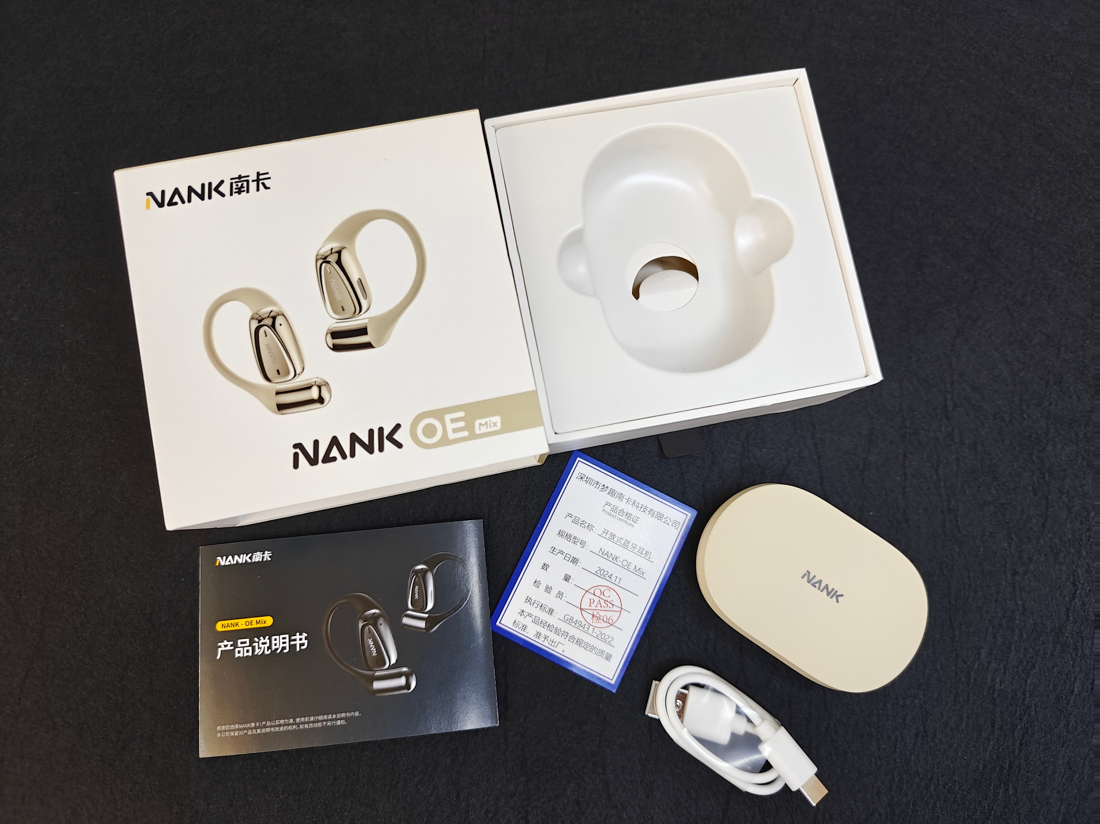 南卡OE Mix的包装设计令人眼前一亮。抽拉式硬纸盒采用哑光质感涂层,搭配磁吸开合设计,开箱瞬间便能感受到品牌对细节的用心。盒内耳机与配件分层嵌套,充电仓、Type-C充电线及说明书整齐排列,附赠的硅胶耳挂更是点睛之笔。这种仪式感十足的包装,完全颠覆了人们对百元级耳机“将就”的固有印象。
