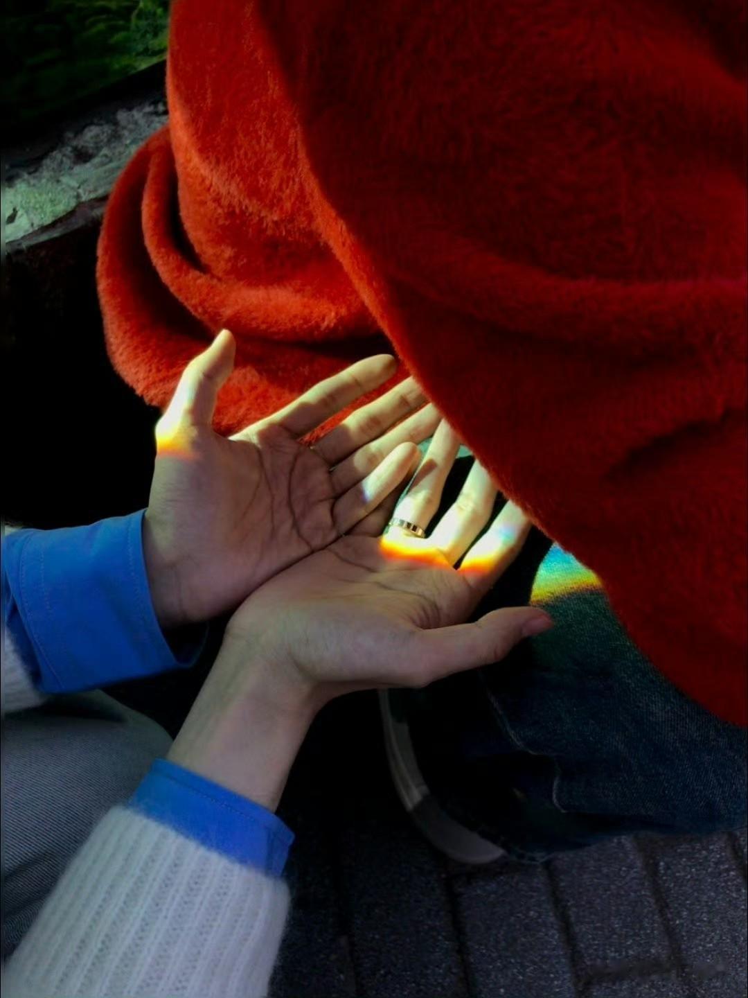 不难看出,两个人一个戴左手一个戴右手都是无名指,这可是传统婚戒的位置啊!