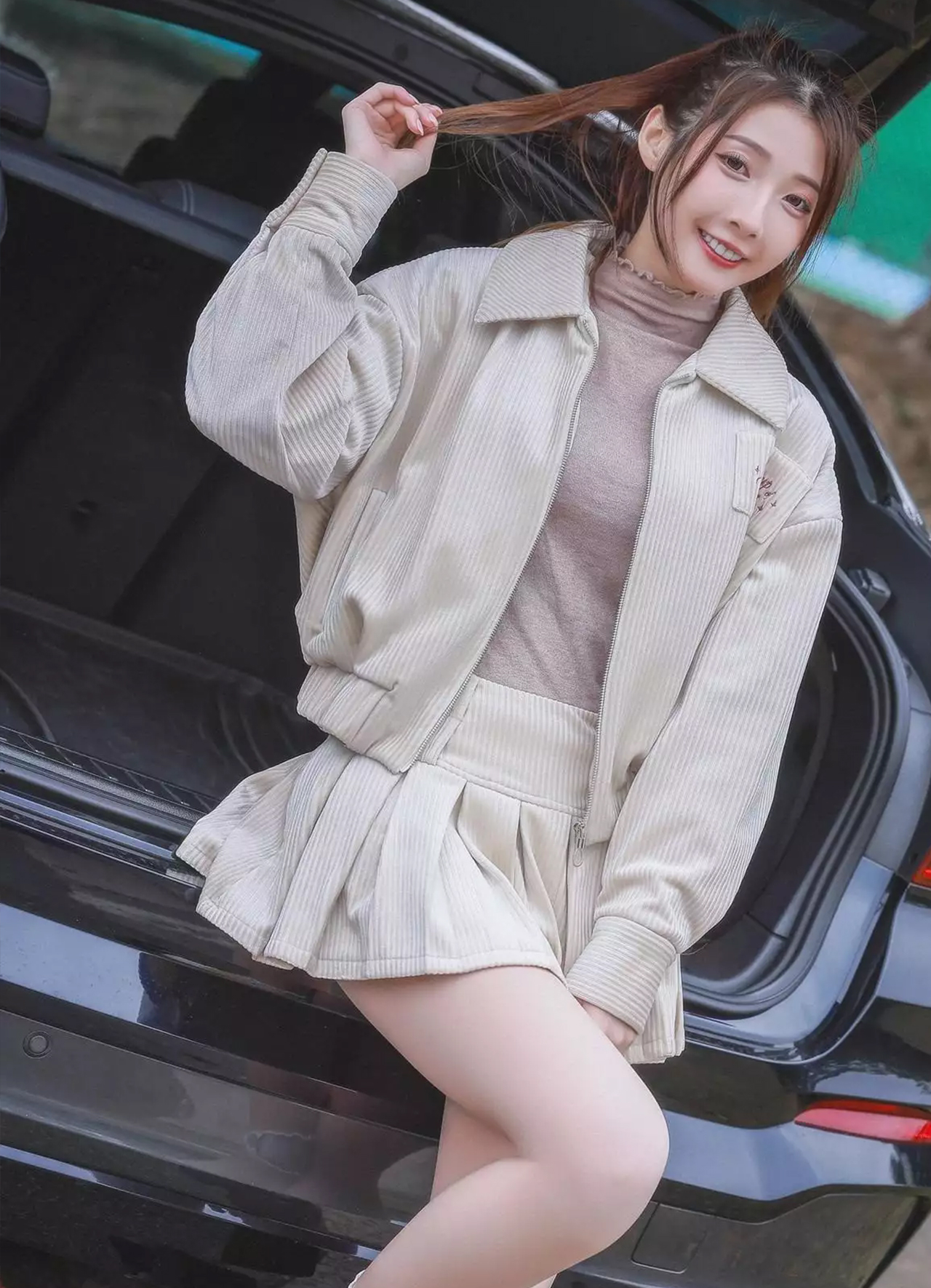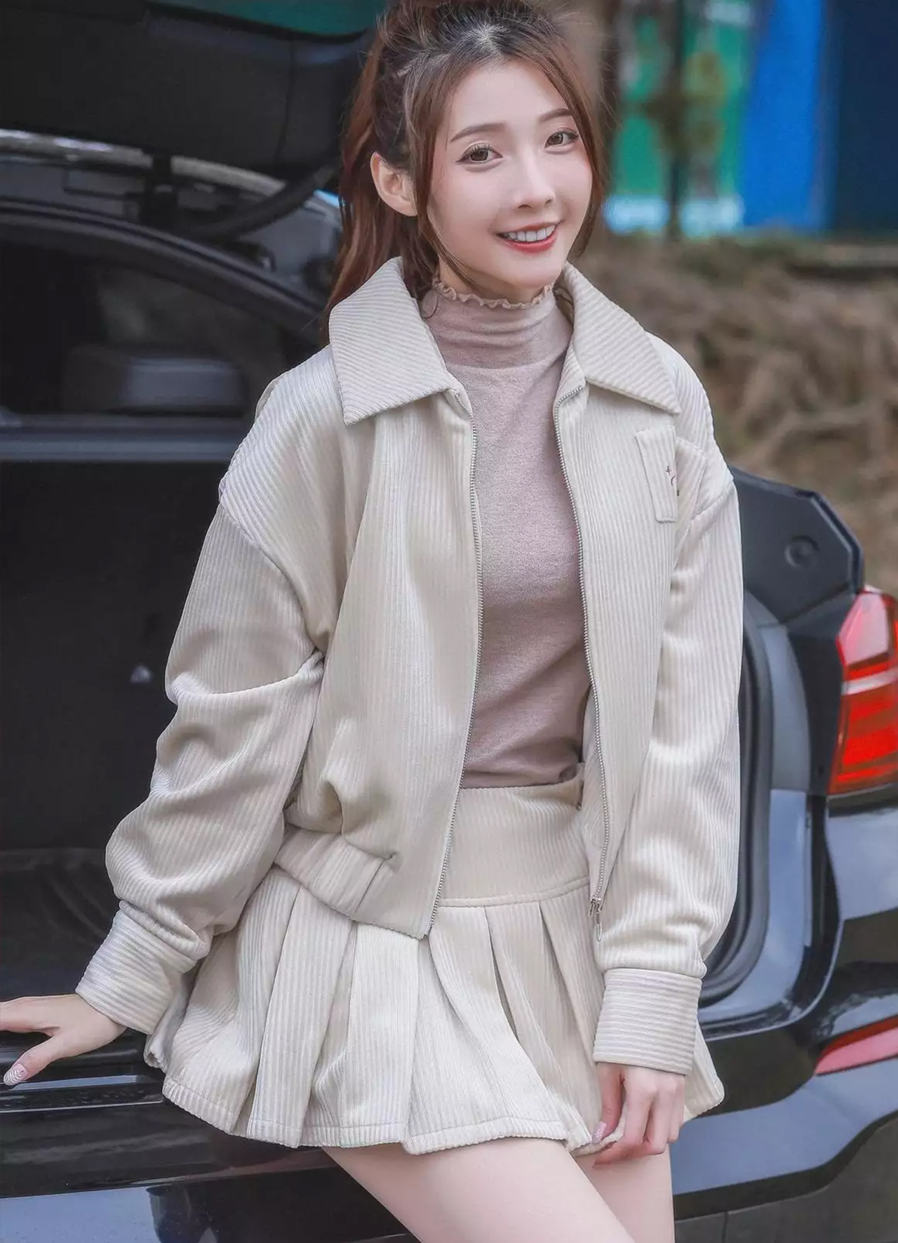 “欢迎关注,每天都有新发现”浅米色灯芯绒外套配同色短裙,毛茸茸的质感温暖又俏皮。内搭浅咖色高领衫,增添层次与温柔。整套搭配色调柔和,笑容甜美,靠在车边的姿势轻松自然,完美诠释了秋日里甜甜的学院少女风。