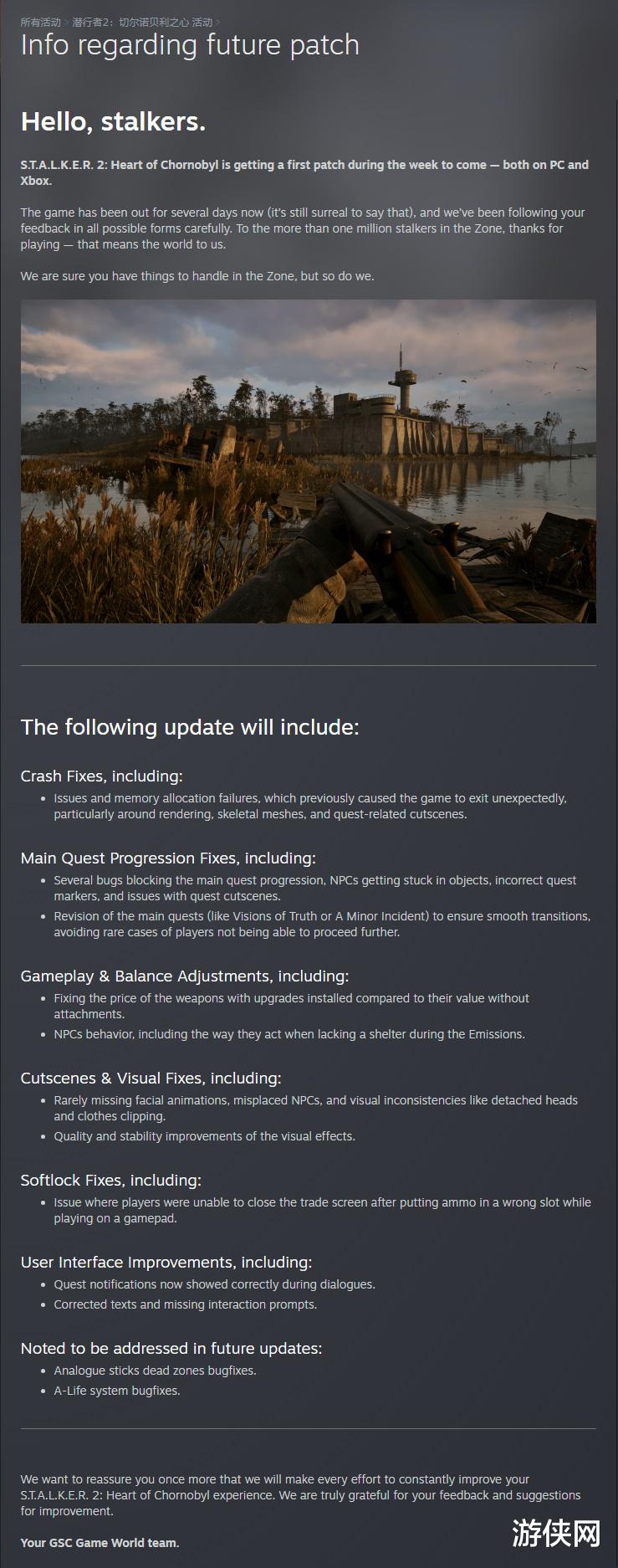 此外,官方还表示,将在未来的更新中修复模拟摇杆死区和A-Life系统错相关的Bug。开发商GSC Game World在公告中表示,官方将尽一切努力不断改善游戏的体验,并感谢了玩家的反馈和改进建议。