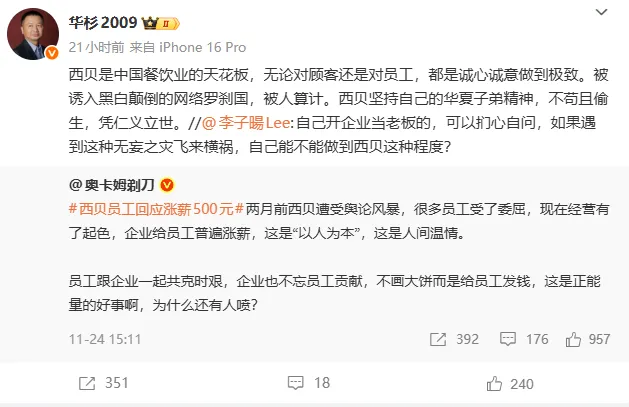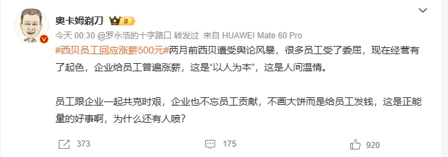 比如有博主表示:两月前西贝遭受舆论风暴,很多员工受了委屈,现在经营有了起色,企业给员工普遍涨薪,这是“以人为本”,这是人间温情。员工跟企业一起共克时艰,企业也不忘员工贡献,不画大饼而是给员工发钱,这是正能量的好事啊,为什么还有人喷?