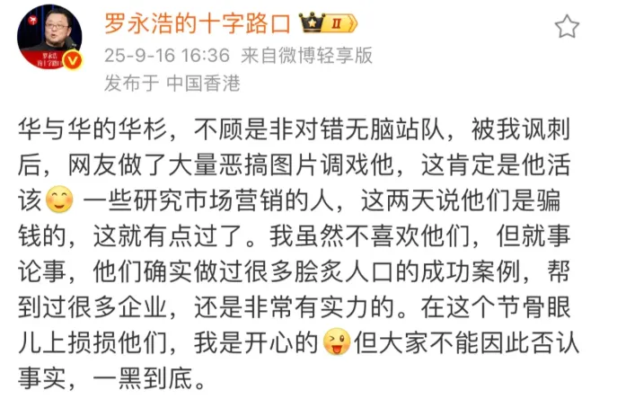 随后,罗永浩还点评道:“华与华的华杉,不顾是非对错无脑站队,被我讽刺后,网友做了大量恶搞图片调戏他,这肯定是他活该,一些研究市场营销的人,这两天说他们是骗钱的,这就有点过了。我虽然不喜欢他们,但就事论事,他们确实做过很多脍炙人口的成功案例,帮到过很多企业,还是非常有实力的。在这个节骨眼儿上损损他们,我是开心的,但大家不能因此否认事实,一黑到底。”