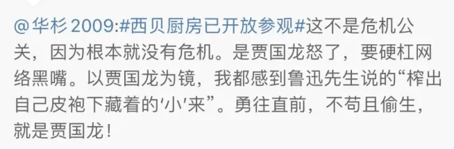 而值得注意的是,在西贝与罗永浩口水战高潮期间,华与华老板在网络公开点评:这不是危机公关,因为根本就没有危机。是贾国龙怒了,要硬杠网络黑嘴。以贾国龙为镜,我都感到鲁迅先生说的“榨出自己皮袍下藏着的‘小’来”。勇往直前,不苟且偷生,就是贾国龙!
