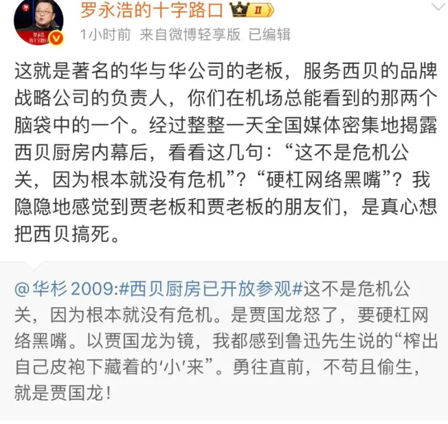 被扣上网络黑嘴的帽子,罗永浩不乐意了,发文回怼,这就是著名的华与华公司的老板,服务西贝的品牌战略公司的负责人,你们在机场总能看到的那两个脑袋中的一个。经过整整一天全国媒体密集地揭露西贝厨房内幕后,看看这几句:“这不是危机公关,因为根本就没有危机”?“硬杠网络黑嘴”?我隐隐地感觉到贾老板和贾老板的朋友们,是真心想把西贝搞死。