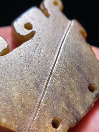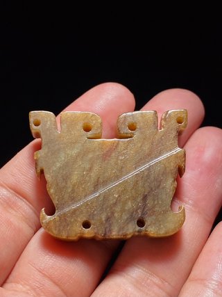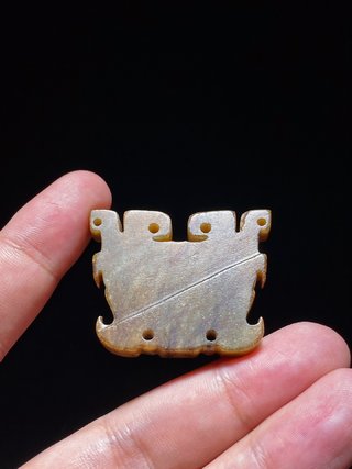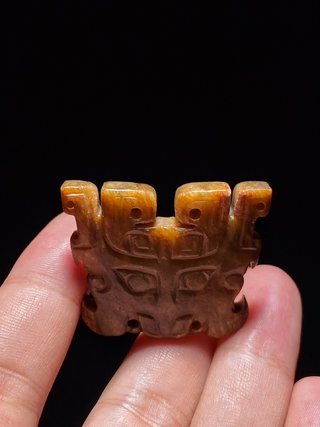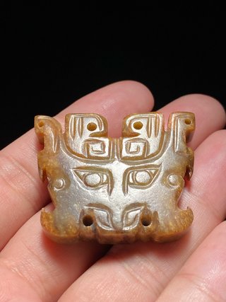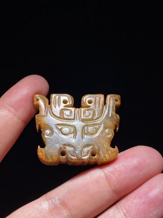 明以前 和田玉籽料沁色 兽面纹 饕餮纹 玉佩 挂件 长4.3宽0.8高3.4厘米 重24.1克 玉佩和田籽料玉质,通体受沁,沁色斑斓,光气精良,玉质包浆老旧,古意盎然。主体部分为饕餮兽面纹,兽面呈对称布局,双目凸起,浮雕高鼻,卷角。玉兽面以商代最具典型,兽面威严而又神秘。西周开始,玉兽面开始成为高级贵族的装饰物,出现在项饰和腕饰上。