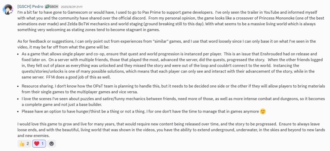 也有玩家认为,这款游戏融合了《幽灵公主》的美术与《塞尔达传说:旷野之息》的理念设计,打造出了体量庞大且迷人的生动世界,同时也针对现场试玩时遇到的一些缺憾(如目前的生存系统较为粗糙,缺乏饥饿、口渴条等设计)给出了意见反馈。