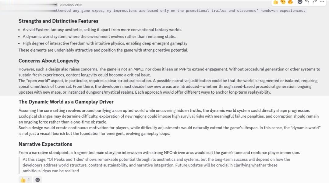 而在海外的社区讨论版上,更是有不少在现场试玩过《山外山》的玩家给出了正面反馈——一位撰写长评的玩家表示,这款游戏的青铜时代东方幻想背景令人着迷,动态的世界系统和环境演化非常真实,高交互高自由度且符合物理直觉的玩法非常有趣,《山外山》展现出了令人印象深刻的潜力,其未来相当值得期待。