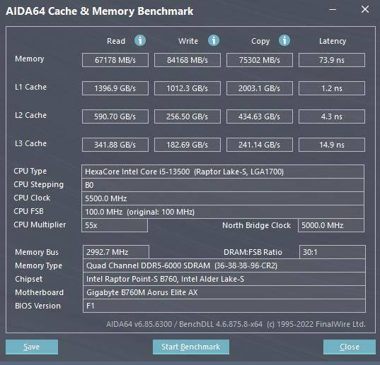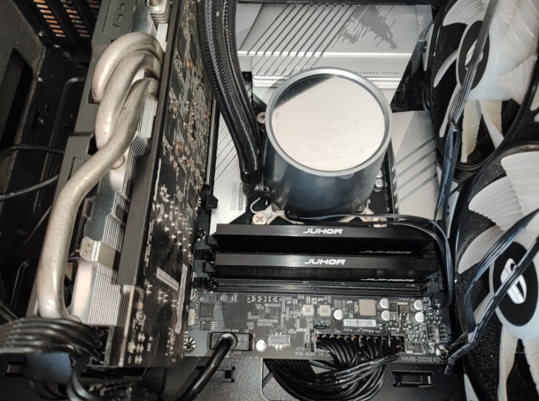 如果想要感受DDR5内存需搭配新一代支持DDR5 内存主板以及英特尔12代处理器方可正常发挥性能。因此我选择了一套12代英特尔平台,主板使用技嘉小雕AX主板的主控芯片采用了IntelB760芯片组, LGA1700的CPU插槽可以支持酷睿十二代及十三代的处理器,并且基本保持可以在一段时间内的适用。CPU为Intel的酷睿i5-13500处理器,一块同品牌1T的m.2的固态硬盘。内存的安装也很简单,但由于DDR5内存本身的防呆口过于接近中间,因此在插入时要仔细将防呆口对应主板内存卡槽直接按下,两边的固定卡就会自动卡位,过程无需工具,非常简单。