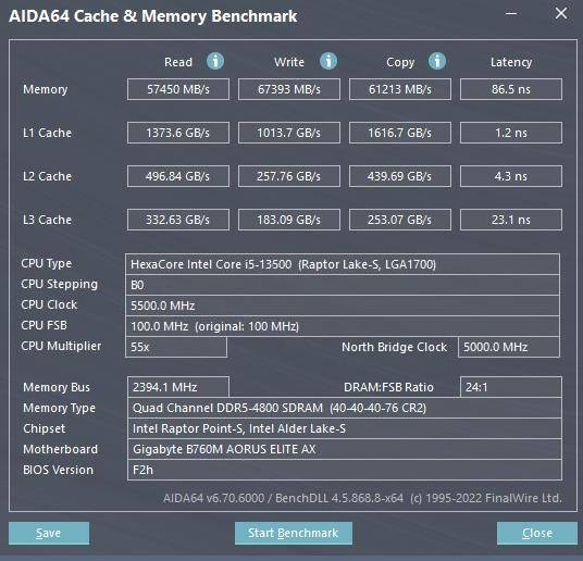 安装完毕电脑顺利开机,无蓝屏,无报错。通过AIDA64内存测试工具可以顺利检测出内存的数据,在默认频率下,DDR5 6000Mhz为4800 Mhz,内存读取速度达到57450MB/s,此时内存的延时为86ns,表现优良。