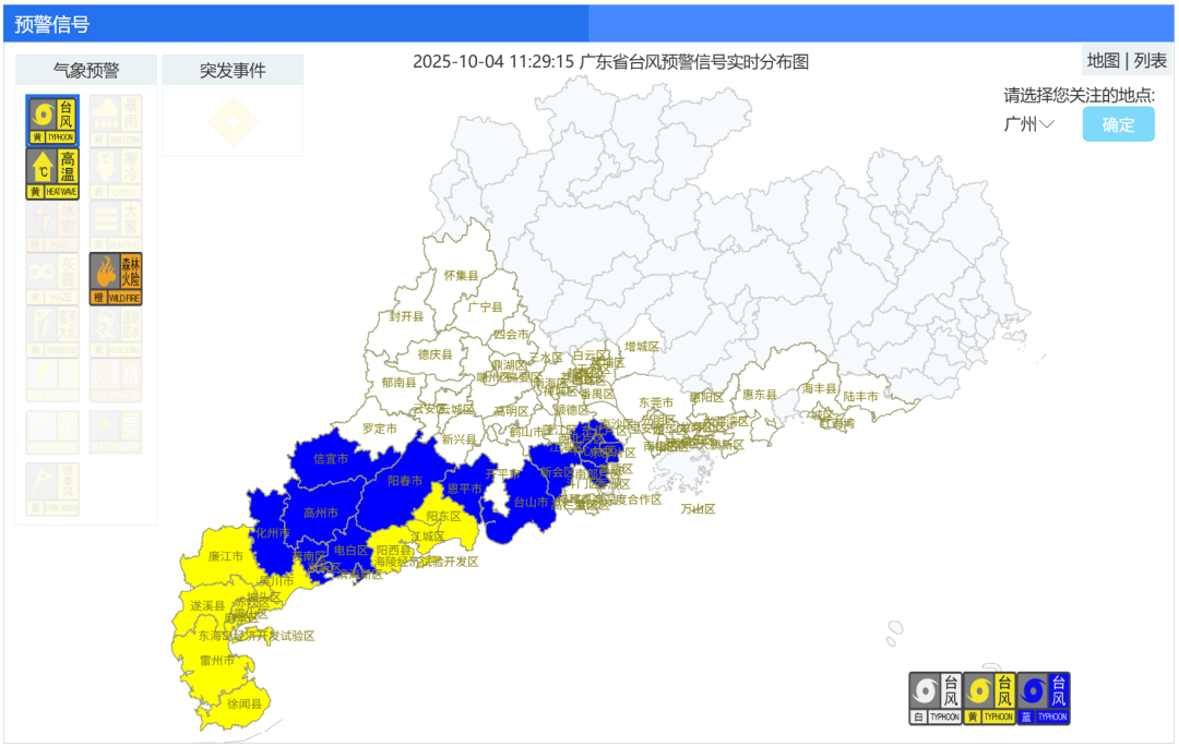 截至 10 月 4 日 11 时 29 分,广东省内各地已发布多类台风预警信号,其中台风黄色预警 16 个、台风蓝色预警 16 个、台风白色预警 58 个,各地正根据预警级别落实相应防范措施。