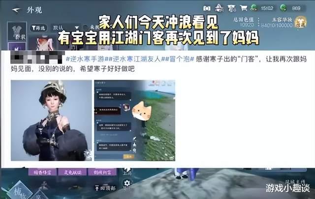 由此,玩家在游戏中捏出了自己过世亲人的形象,让“妈妈”陪在自己身边,和自己一起看风景,边走边聊天,江湖从此有了自己的温度。